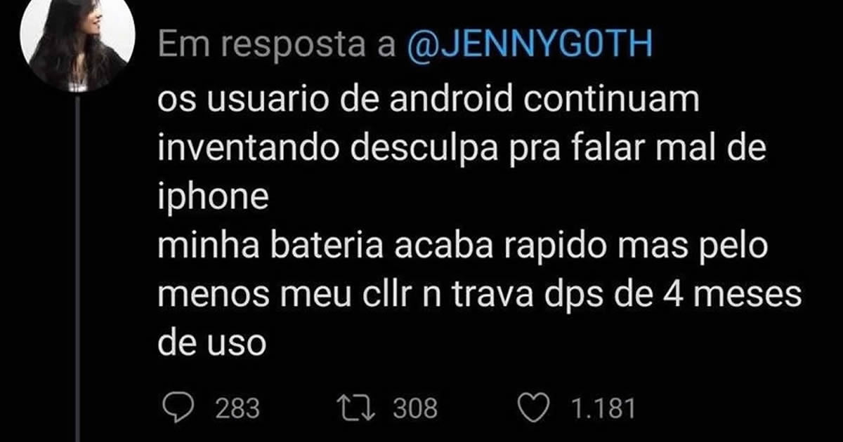 Desculpa de quem fala mal de Iphone 🗓️22 de novembro de 2022🏷️PrintsO povo adora criar treta e falar mal de produto que não tem. Já ouvi fala muito de treta entre Android e Iphone. Qual seu celular hoje em dia e qual é coisa mais chata nele?
