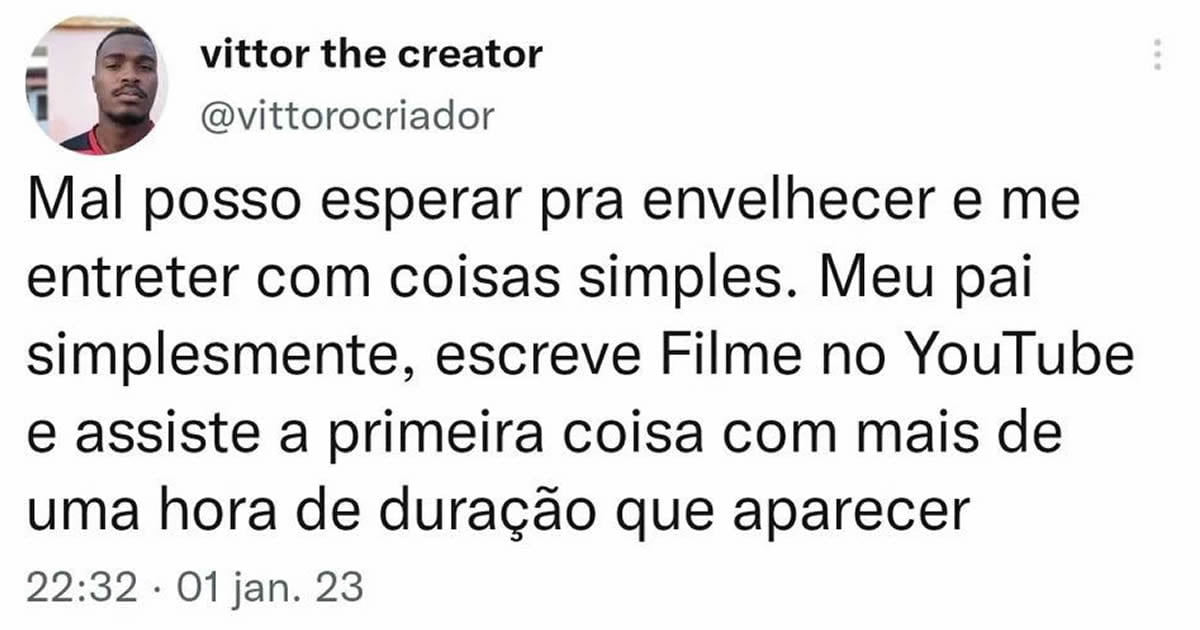 Minha meta para ser idoso 🗓️4 de janeiro de 2023🏷️PrintsVocê tem alguma meta para ser idoso, acredito que nessa parte de entrar no Youtube e assistir primeira coisa que acha na frente vai ajudar muito. Eu mesmo passo horas as vezes procurando coisas e acabo nem assistindo nada.