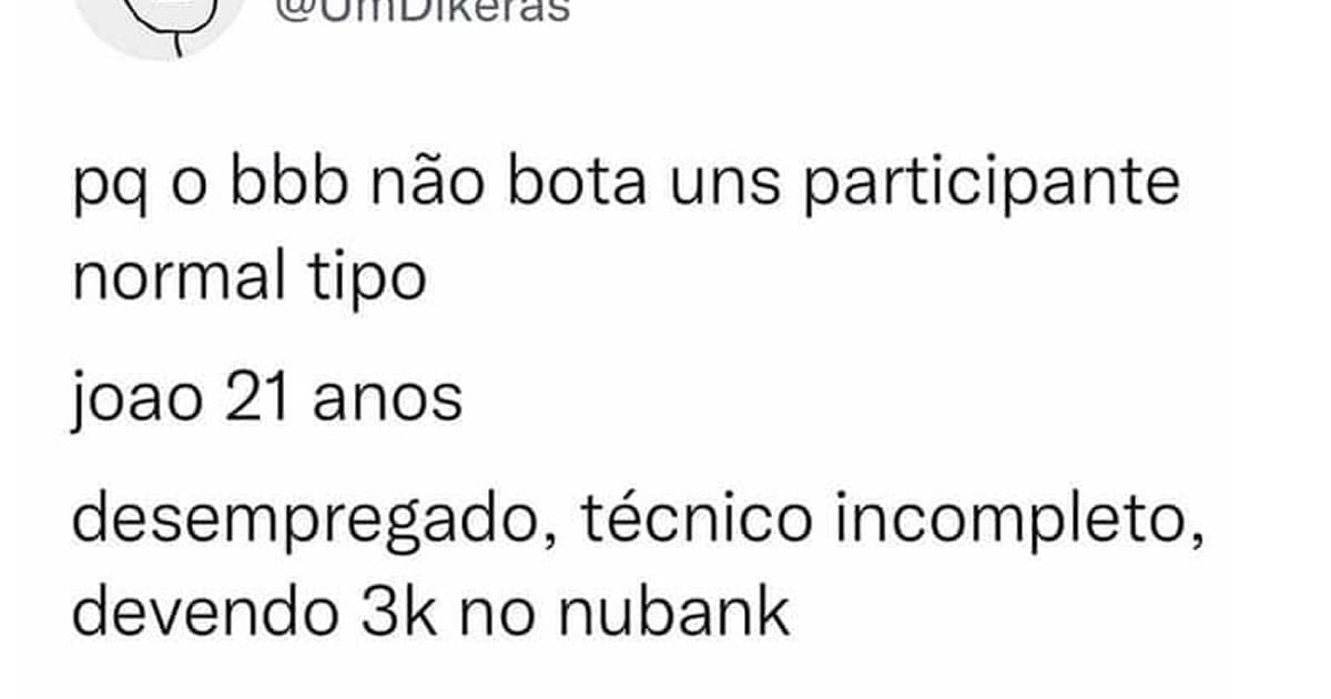 Por que o BBB não tem participante normal? 🗓️17 de janeiro de 2023🏷️PrintsNo começo tinha alguns participante normais que tiveram muito sucesso porem com tempo o BBB só colocou pessoas famosos ou rico já. Qual sua opinião sobre isso?