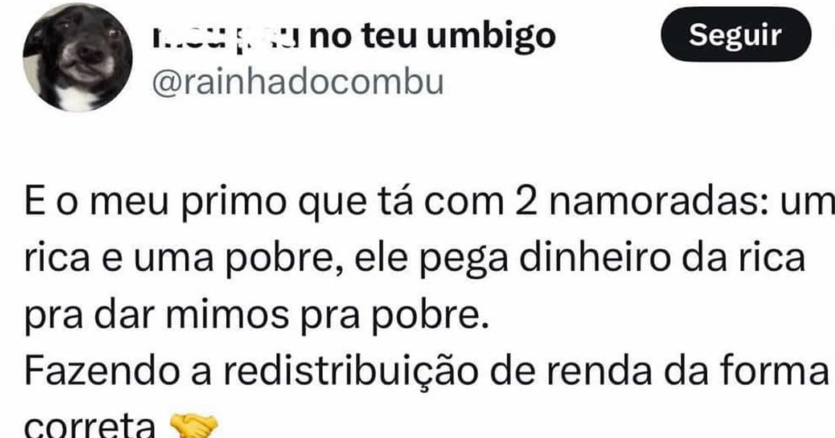 Enquanto a namorada rica está ocupada comprando joias caras e roupas de grife, a namorada “pobre” está recebendo surpresas que até os anjos ficariam com inveja. É como se ele estivesse equilibrando o ecossistema do relacionamento, garantindo que ambos recebam seu quinhão de presentes – um pouco mais para um lado, é verdade, mas, ei, pelo menos está havendo uma redistribuição de alguma forma.