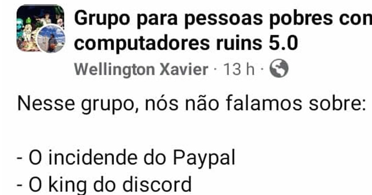 Em um grupo para pessoas pobres com computadores ruins, certas histórias são tão lendárias que até os membros mais antigos preferem não mencionar. Não se fala sobre o incidente do Paypal que quase levou um membro a vender o próprio computador, nem sobre o “king do Discord”, cujo reinado foi mais curto do que a garantia do HD de 128GB.