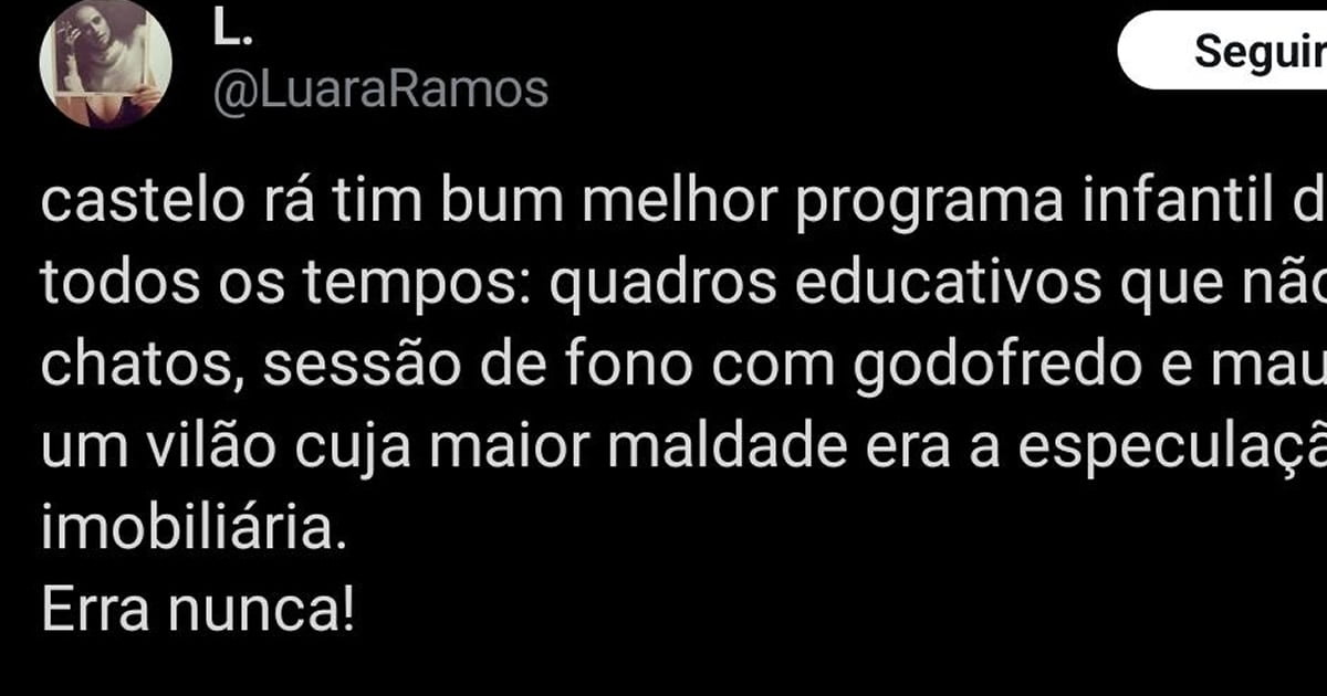 “Castelo Rá-Tim-Bum” é um patrimônio cultural brasileiro. Um programa onde até a especulação imobiliária virava tema de vilania, mostrando que as crianças já eram preparadas para enfrentar o mundo real desde cedo. Quem precisa de super-heróis combatendo alienígenas quando temos crianças enfrentando o drama dos preços dos imóveis?