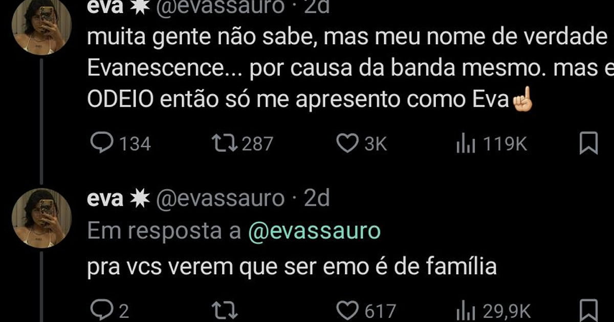 Quem nunca teve uma fase emo, que atire a primeira pedra! Mas imagine ser batizado com o nome de sua banda favorita e depois descobrir que nem gosta tanto assim dela. A vida é cheia de ironias, e ser chamado de Evanescence é uma delas. A pessoa, ao longo dos anos, vai explicar o porquê desse nome e, ao mesmo tempo, tentar fugir da sombra de ser associada à famosa banda de rock gótico. É quase como carregar uma camiseta de uma banda que você não gosta, mas que está colada na sua pele!