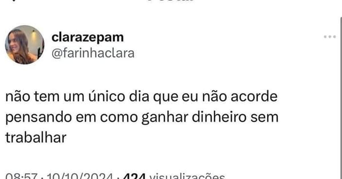 Essa postagem é um verdadeiro manifesto da geração que sonha em ser rica sem sair do sofá! A Clara, com seu pensamento empreendedor, acorda todos os dias pensando em como ganhar dinheiro sem trabalhar. É como se ela tivesse encontrado a fórmula mágica da vida, mas ainda não compartilhou com o resto do mundo.