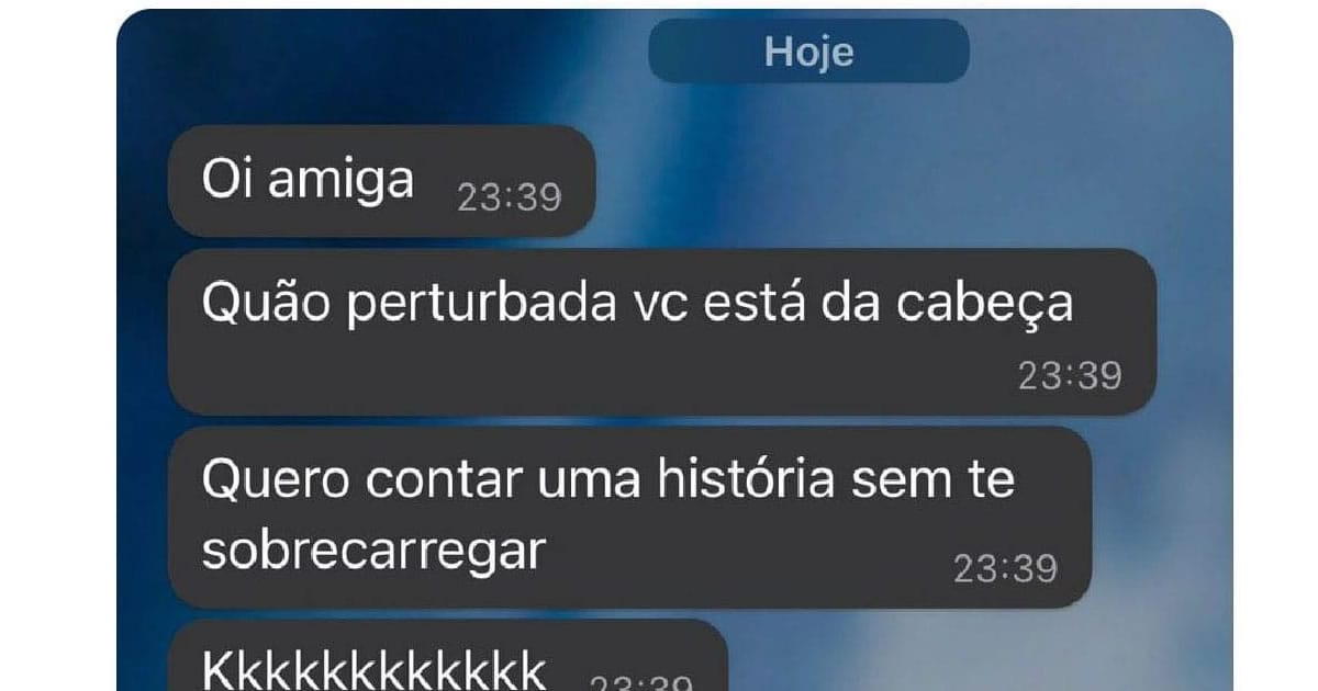 É como se a amiga estivesse se preparando para um drama digno de novela, mas, em vez disso, quer contar uma história que, segundo ela, não vai sobrecarregar a outra. E, claro, a resposta é um “kkkkkkkkkkk”, o que mostra que, no fundo, a situação é tão absurda que só resta rir.