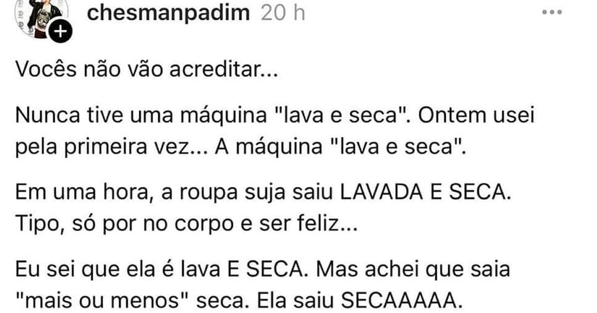 E claro, a expectativa de que a roupa saia “mais ou menos” seca se transforma em uma surpresa: ela saiu SECAAA! Quase um milagre da modernidade! No fim, a lição é clara: nunca subestime o poder de uma boa máquina de lavar. E quem sabe, talvez a próxima vez você não se sinta tão perdido quanto um personagem de desenho animado tentando entender a tecnologia.