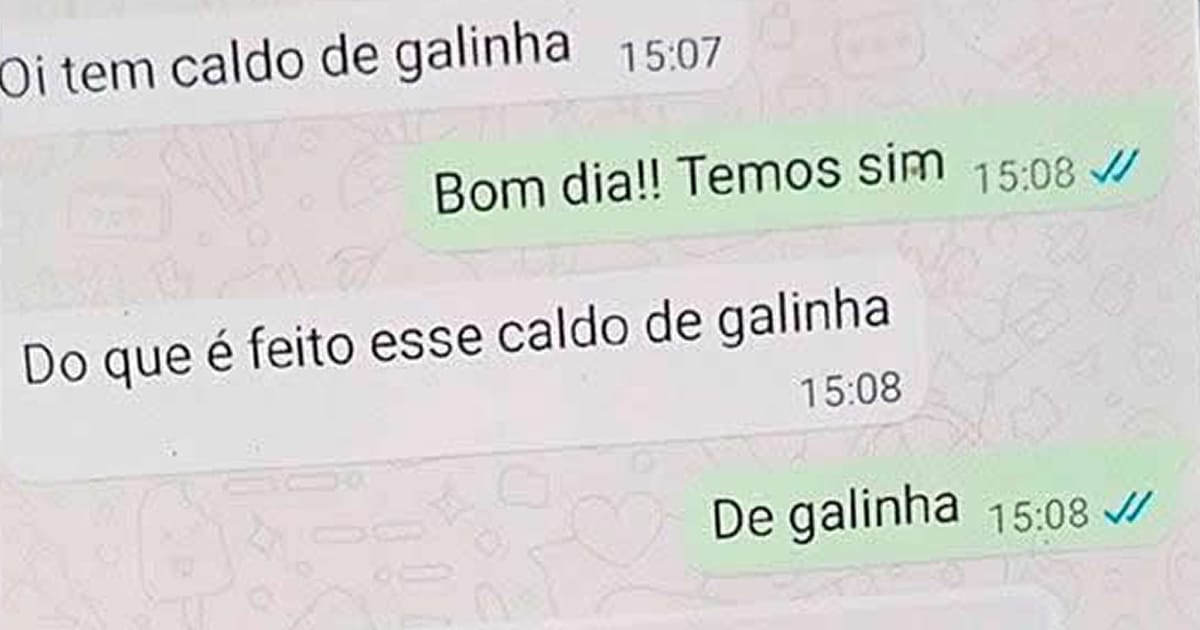 Ah, a arte da comunicação moderna! Neste diálogo, temos um verdadeiro exemplo de como a curiosidade pode levar a reações inesperadas. Perguntar sobre o que é feito o caldo de galinha pode parecer uma simples dúvida, mas, neste caso, virou um festival de reações!