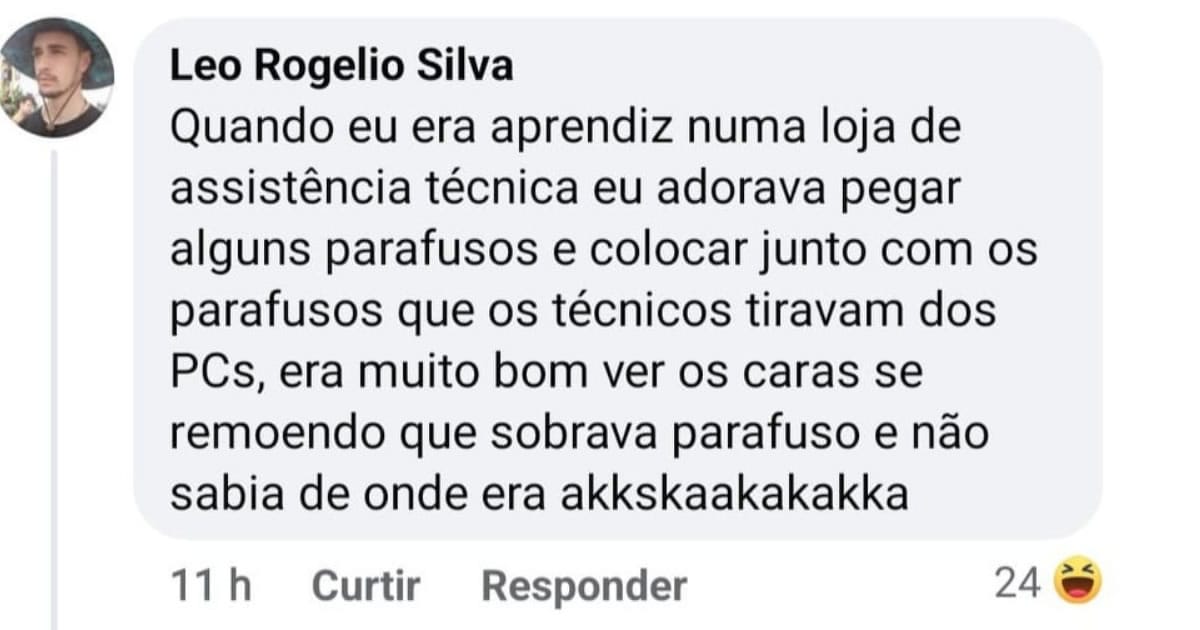 Esse aprendiz aí não só brincava com o psicológico dos colegas, ele formava engenheiros emocionais! Porque não existe faculdade que ensine a lidar com a dúvida existencial: **”De onde saiu esse parafuso?”**. Com certeza, ele fez muito técnico repensar a carreira, perder o sono e até prometer nunca mais abrir um gabinete sem a bênção de São TI.