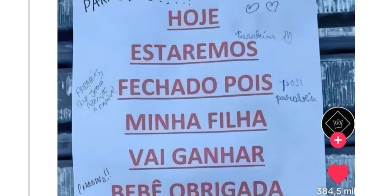 Ah, a criatividade brasileira não tem limites! Nesta imagem, temos um cartaz que, à primeira vista, parece ser uma simples notificação de fechamento, mas que rapidamente se transforma em uma verdadeira obra-prima da comunicação. Aparentemente, a razão do fechamento é nada menos que um evento monumental: a filha da autora está prestes a ganhar um bebê! E quem não ficaria animado com isso?