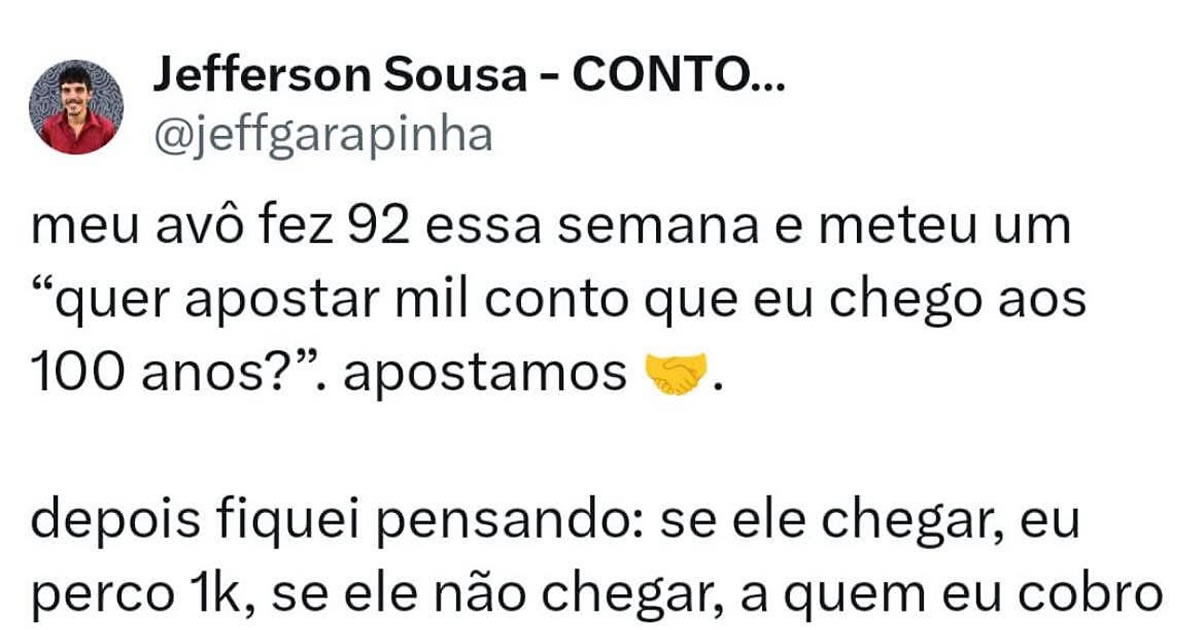 A genialidade está na matemática emocional: se ele chegar aos 100, você paga rindo. Se ele não chegar… bom, o Pix vai ter que ser espiritual. Um plano perfeito, sem brecha jurídica, sem fiador e com cláusula final assinada com bengala e malícia.