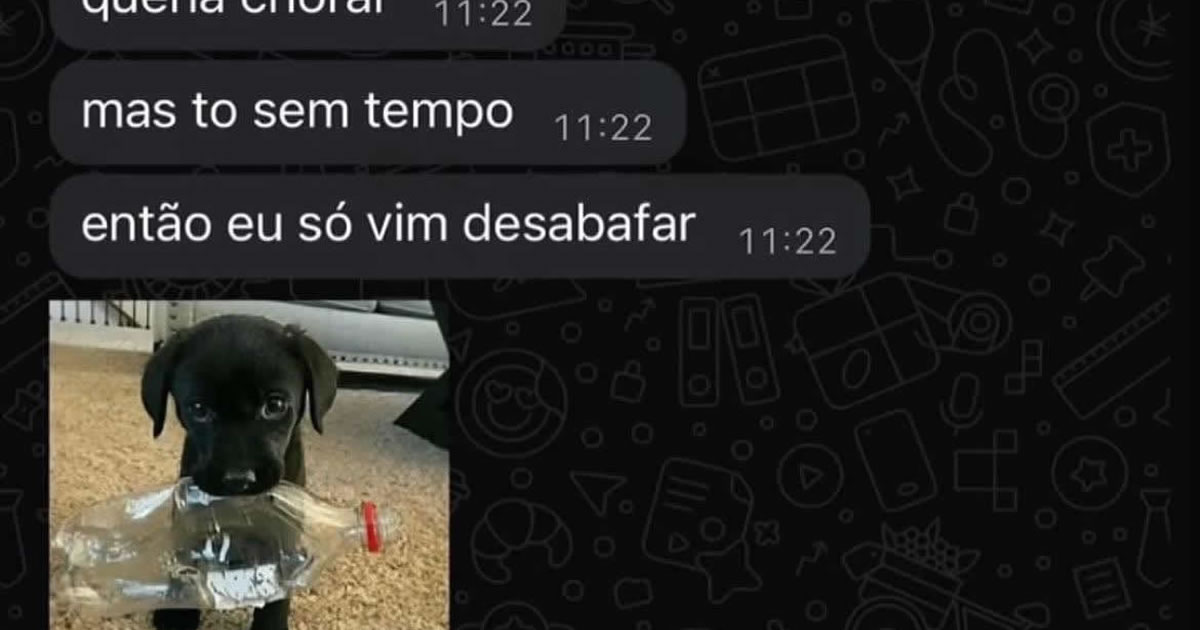 Chorar hoje em dia virou item de luxo. A vida adulta tá tão corrida que até o sofrimento entra na agenda: “Chorar – terça, das 19h às 19h07, se sobrar tempo”. E quando a pessoa resolve desabafar, o desabafo vem no formato de filhote com garrafa na boca, porque nada traduz tão bem a bagunça emocional quanto um cachorro tentando mastigar o próprio drama. A imagem já diz tudo: “estou na merda, mas continuo fofo”.