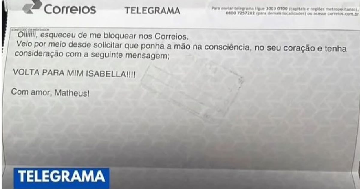 Essa imagem é a prova viva de que o brasileiro não aceita derrota emocional, ele só muda o canal de comunicação. Quando acaba a internet, acaba o bloqueio, mas nunca acaba a criatividade. O romantismo aqui não morreu, apenas foi reenviado com aviso de recebimento. É o amor raiz, sem Wi-Fi, sem visto por último, sem status online, mas com carimbo oficial e taxa paga. A pessoa não superou, só terceirizou o sentimento para uma estatal. É a persistência elevada ao nível administrativo, onde o coração sofre, mas segue todos os protocolos.