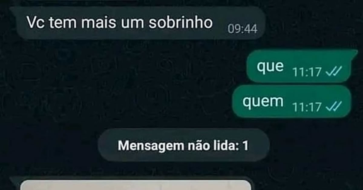 Essa imagem é a prova científica de que notícia de família no Brasil nunca vem completa de primeira. A frase curta, jogada no ar, cria imediatamente um suspense digno de novela das nove, só que com orçamento emocional zero. O cérebro já começa a calcular árvore genealógica, herança inexistente e possíveis tretas futuras, tudo antes do café esfriar. O atraso na resposta transforma a curiosidade em ansiedade pura, enquanto o aplicativo faz questão de mostrar que existe mensagem não lida, só para aumentar o drama. É o famoso aviso que muda o dia sem explicar absolutamente nada.