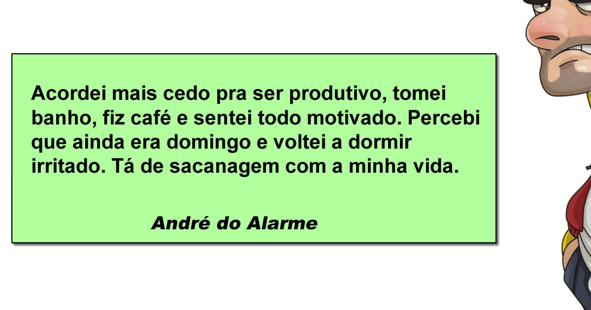 Produtividade no domingo é igual promessa de dieta na segunda-feira, todo mundo acredita por uns cinco minutos e depois a realidade dá um tapa na cara. A imagem entrega aquele momento em que a pessoa acha que virou o protagonista da própria virada de vida, já tomou banho, fez café, sentou todo focado, sentindo a energia do coach interior… e descobre que ainda é domingo. É o universo dizendo “calma, guerreiro, isso aqui é só um teste grátis da disciplina”. O nome “André do Alarme” já nasce como patrimônio cultural brasileiro, representando a nação que acorda cedo sem necessidade e fica com ódio do relógio pelo resto do dia. A frase final soa como boletim de ocorrência emocional contra o calendário.