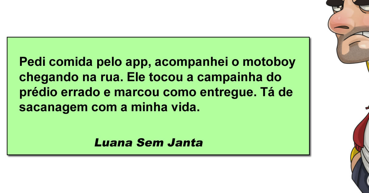 O boneco com cara de poucos amigos representa todo mundo que já encarou a tela do celular em silêncio, negociando com o além e pensando em ligar pro restaurante ou aceitar o destino. A assinatura “Luana Sem Janta” já nasce como personagem oficial da vida adulta moderna, patrocinada pelo ódio e pela maionese que nunca chegou. É o tipo de situação que transforma gente pacífica em vilã de novela das nove. Moral da história: rastrear pedido não evita sofrimento, só aumenta o drama em tempo real. No Brasil, até a comida resolve fazer suspense. Comer virou esporte radical, e pedir delivery é prova de fé.