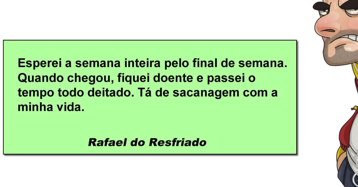 O final de semana tem um talento especial para decepcionar quem cria expectativa demais. Ele passa a semana inteira sendo vendido como o evento mais aguardado da existência, quase um feriado pessoal que promete alegria, liberdade e dignidade. Mas, quando finalmente chega, ele simplesmente entrega um pacote premium de dor no corpo, nariz entupido e aquela sensação humilhante de fragilidade humana. O final de semana não é um descanso, é uma armadilha emocional com prazo marcado.