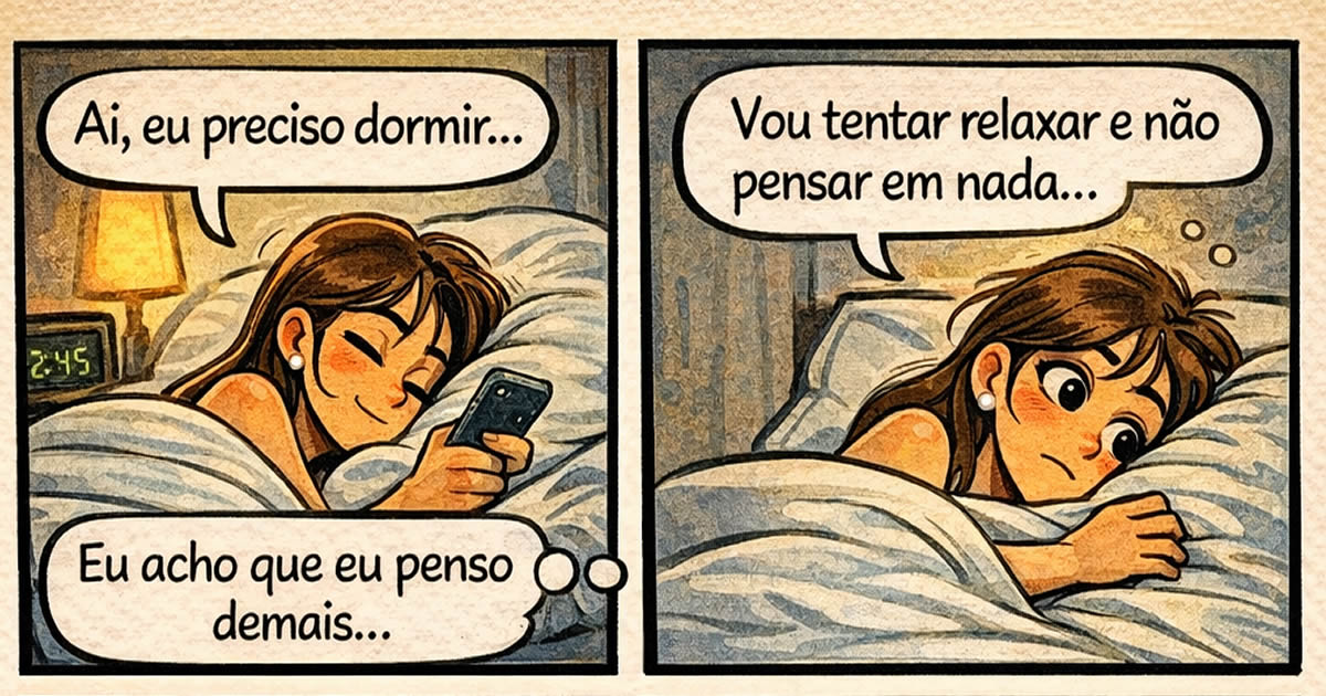 Existe uma grande mentira que a gente conta pra si mesmo todas as noites: a de que vai deitar, relaxar e simplesmente desligar o cérebro como se fosse um interruptor. Na prática, o que acontece é o oposto. A mente entra em modo festival, trazendo lembranças de 2009, decisões questionáveis de três dias atrás e teorias completamente inúteis que nunca apareceram durante o dia. É como se o cérebro tivesse um compromisso sério em não deixar a pessoa dormir em paz.
