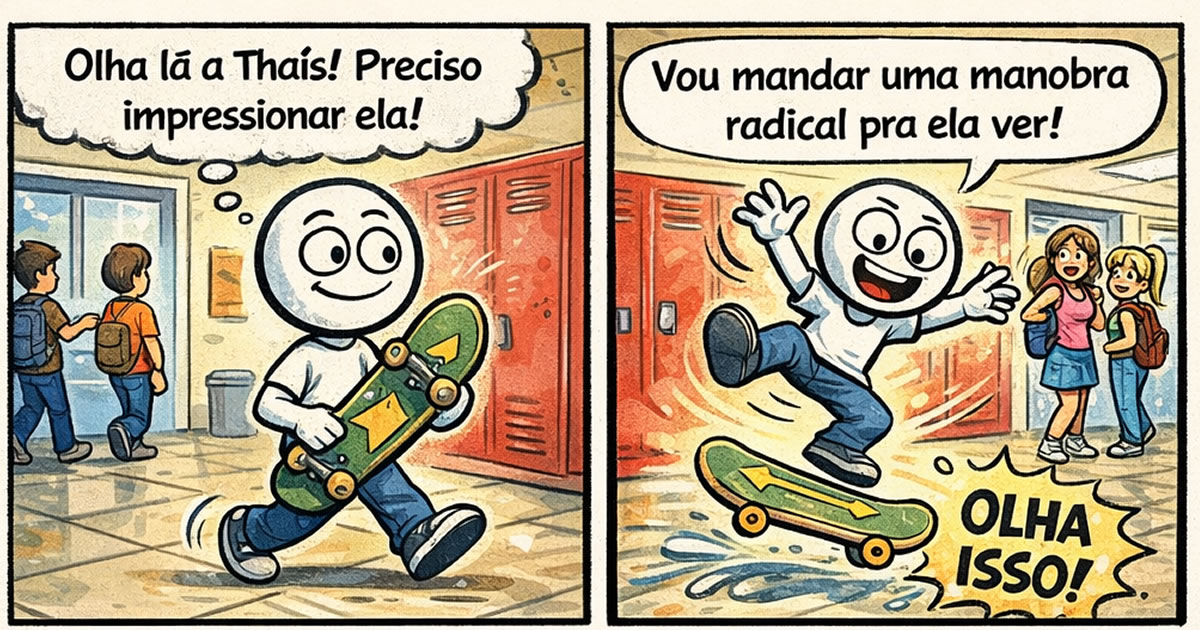 E o mais curioso é que o brasileiro tem um talento especial pra escolher o pior momento possível pra brilhar. Sempre tem um chão molhado, um obstáculo invisível ou simplesmente o universo conspirando contra. A tentativa de impressionar vira um espetáculo completamente diferente, onde o destaque não é a habilidade, mas o nível de constrangimento atingido. E no fim, ao invés de admiração, o que sobra é aquele combo clássico: silêncio constrangedor, risada alheia e autoestima pedindo reinício.