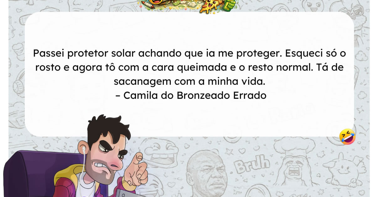 O problema nem é só a queimadura, é o combo completo de arrependimento e aparência duvidosa. A autoestima tira férias enquanto o espelho vira inimigo declarado. E o pior: sempre aparece alguém pra comentar, porque desgraça estética nunca passa despercebida. A pessoa sai querendo um bronzeado natural e volta com um projeto experimental de dois tons que ninguém pediu. No fim, fica a lição que ninguém aprende: o erro não foi o sol, foi a confiança exagerada de quem achou que cinco minutos de atenção eram suficientes pra enfrentar o clima tropical.