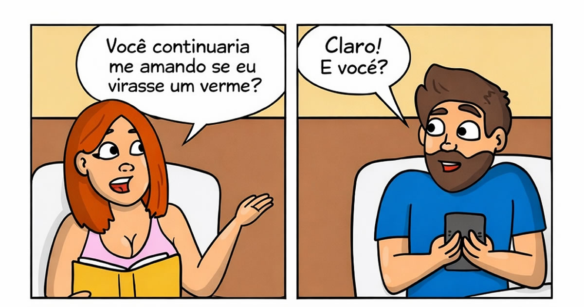 Relacionamento moderno não quer paz, quer teste psicológico nível Enem emocional. A pergunta do verme já virou praticamente cláusula contratual do namoro, tipo “aceita amar em todas as formas possíveis, inclusive rastejando?”. O problema nunca foi a resposta, porque todo mundo já aprendeu que o certo é dizer sim. O perigo mora no detalhe, porque enquanto um tá pensando em amor eterno, o outro já tá imaginando virar um verme estiloso, quase um protagonista de anime subterrâneo.