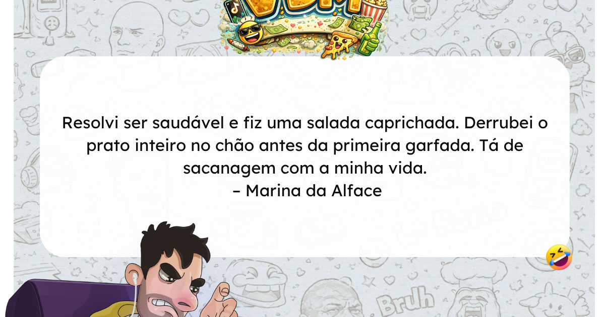 O mais engraçado é que comida saudável já exige esforço emocional só de existir. Ninguém olha pra uma salada e pensa “que vontade absurda de viver isso aqui”. É sempre uma escolha racional, quase um contrato com a consciência. Aí, quando finalmente acontece, o prato decide fazer cosplay de queda livre. No fundo, isso reforça uma teoria importante: talvez o problema nunca tenha sido a dieta, e sim o universo sabotando quem tenta melhorar. Porque errar com pizza é triste, mas aceitável. Agora, perder salada é praticamente um sinal de que a vida prefere ver a gente feliz… e bem alimentado do jeito errado.